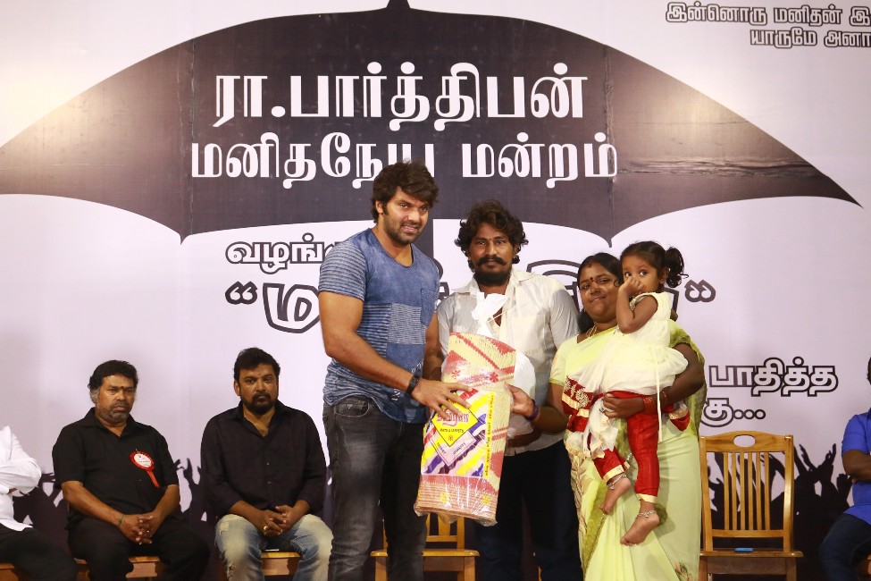 இந்த நிலையில் இன்று பார்த்திபன் மனித நேய மன்றத்தின் மூலம் பாதிக்கப்பட்ட ஆயிரத்துக்கு மேற்பட்ட மக்களுக்காக , மருத்துவ முகாம் , குடிமைப் பொருள்கள், உணவு , ரத்த தான முகாம் என்று ஒரு முழுமையான உதவி முகாம் நடத்தி பலரையும் நெகிழ வைத்தார் .