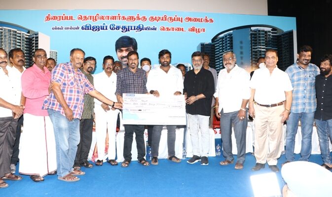 திரைப்பட தொழிலாளர் சம்மேளனம் சார்பில் சென்னையில் எழுப்பப்பட்டு வரும் அடுக்குமாடி குடியிருப்பு திட்டத்திற்கு விஜய் சேதுபதி ஒரு கோடி ரூபாய் நன்கொடையாக வழங்கினார்.