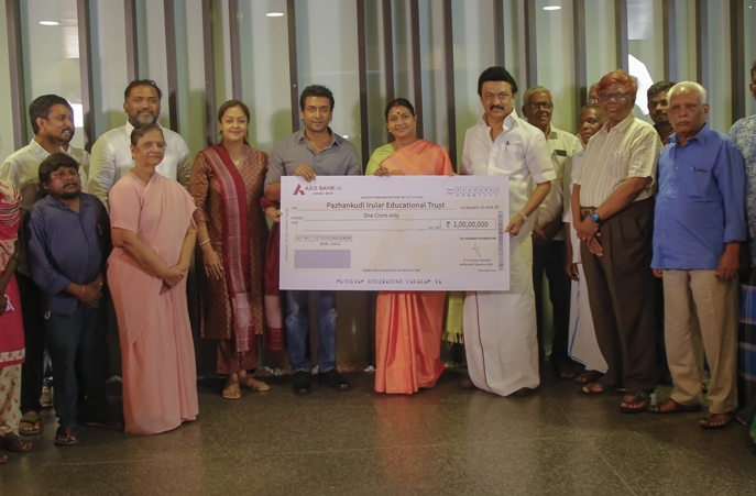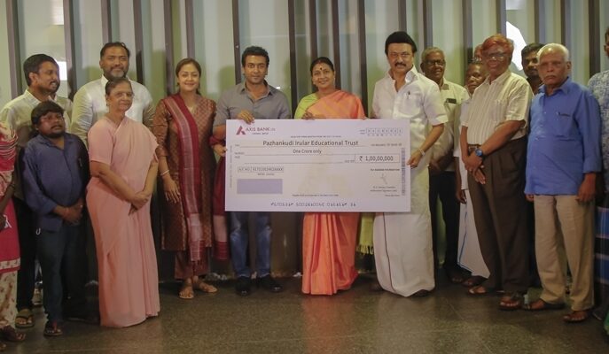 பழங்குடி இருளர் இன மக்களின் நலனுக்காக ஜோதிகா – சூர்யாவின் 2டி நிறுவனம் சார்பில் ஒரு கோடி ரூபாய் நிதி உதவி, தமிழக முதல்வர் மு க ஸ்டாலின் அவர்களின் முன்னிலையில் பழங்குடி இருளர் பாதுகாப்புச் சங்கத்தின் பொறுப்பாளர்களிடம் ஒப்படைக்கப்பட்டது