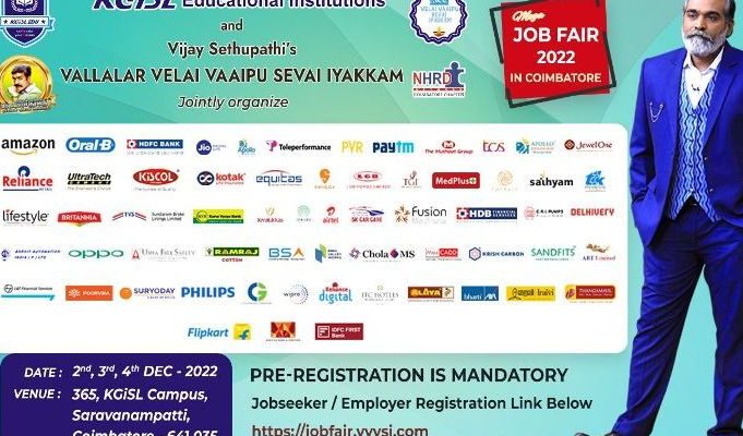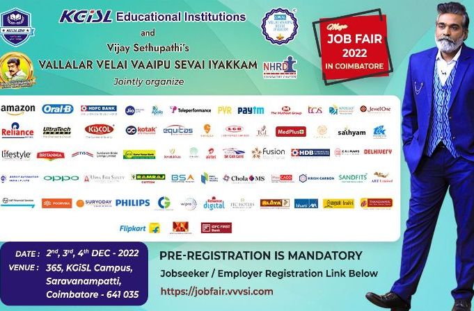 விஜய் சேதுபதியின் வள்ளலார் வேலை வாய்ப்பு சேவை இயக்கம் & KGISL Educational Institutions கல்வி நிறுவனங்கள் இணைந்து நடத்தும் மூன்று நாட்கள் (2022- டிசம்பர் 2ம் தேதி, 3ம் தேதி, 4ம் தேதி) மாபெரும் வேலை வாய்ப்பு முகாம் கோவை மாநகரில் பிரமாண்டமாக நடைபெறவுள்ளது. இந்த வேலை வாய்ப்பு முகாமின் நோக்கம் 3 நாட்களில் 20000+ இளைஞர்களுக்கு வேலை கிடைக்க உதவுவது.